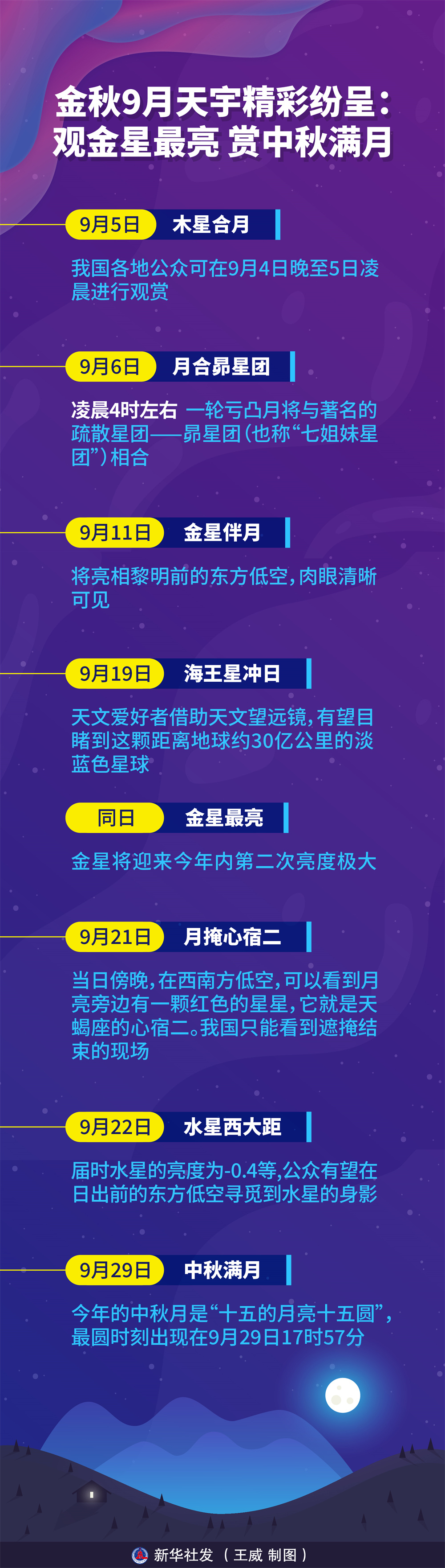 天文预报显示,木星合月、月合昴星团、金星伴月、海王星冲日、金星最亮、月掩心宿二、水星西大距、中秋满月等天象将在9月天宇“扎堆”亮相。
