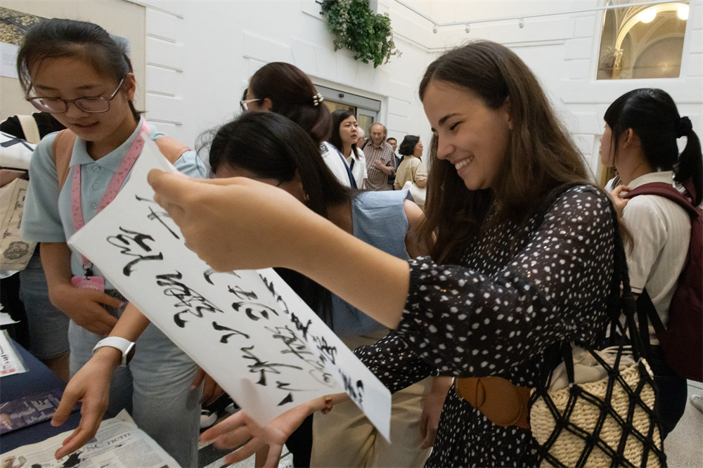 8月29日,嘉宾在匈牙利布达佩斯体验中国书法。“美美与共——中国匈牙利诗歌吟诵会”暨“汉字与中华文明”展开幕式29日在位于匈牙利首都布达佩斯的匈牙利国家外文图书馆举行。
