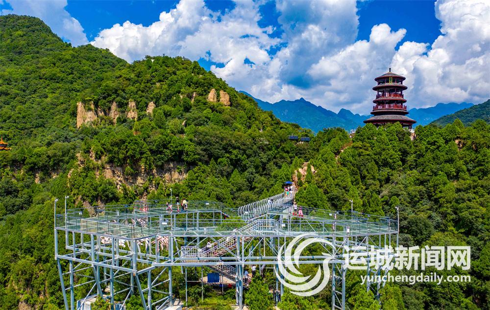 登上望仙楼,环顾四周,只见层峦叠嶂,苍翠葱茏;山中绿意盎然,凉风习习。向北远眺,历山舜王坪上云雾笼罩,仿佛能看到舜帝驾牛耕地的场景。望仙楼下的深谷里,玻璃搭建的悬崖栈桥、横跨峡谷的悬空吊桥与远处后河水库交相辉映,组成一幅大美图画。俯瞰后河水库,正面恰似一条巨龙飞舞,穿行在群山峻岭间,侧面的山石组成两只金龟,俯首戏水。工作人员说,每每雨过天晴,望仙楼下云雾缭绕,宛如仙境。