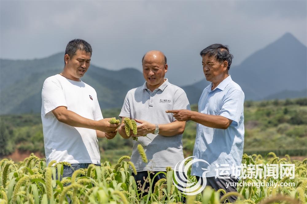 8月29日,平陆县三门镇望原村小杂粮基地,当地镇村干部在向种植户了解谷子长势情况。