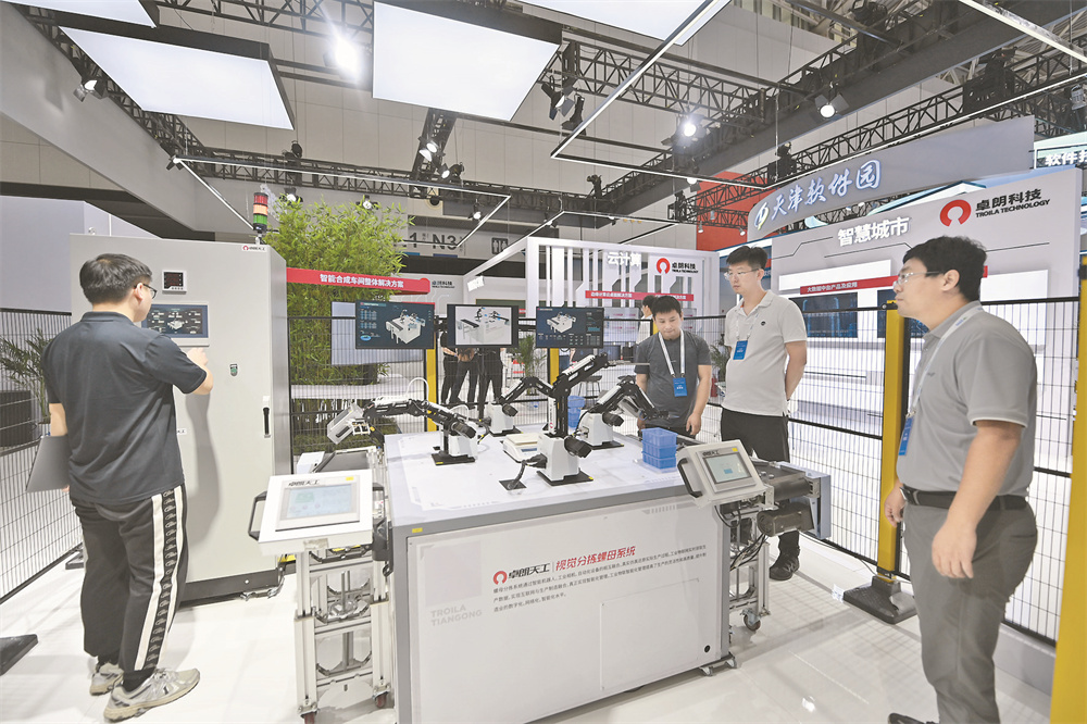 8月31日,参会人员在第二十五届中国国际软件博览会软件成果展上演示视觉分拣螺母系统。