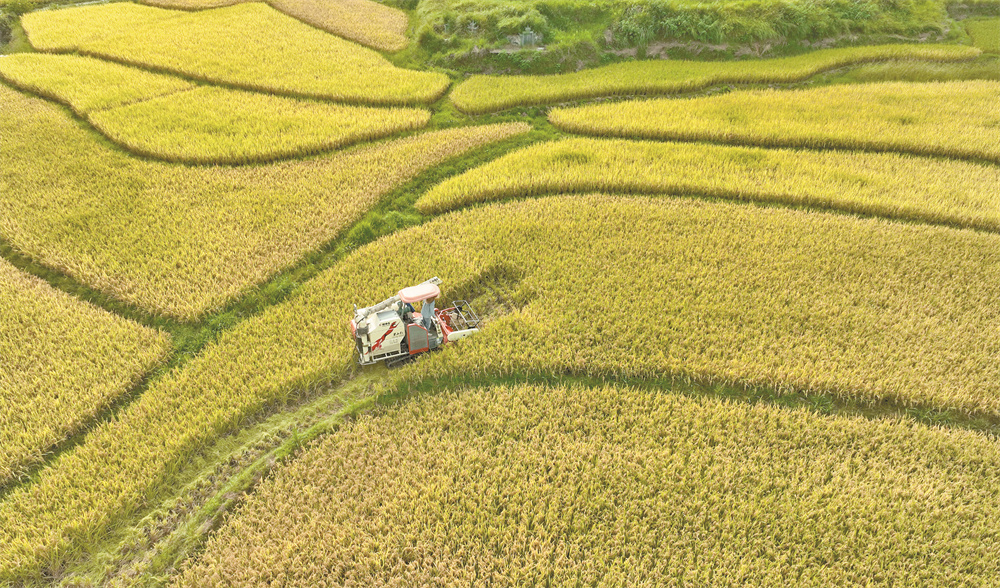 8月31日,在湖南省怀化市通道侗族自治县双江镇马龙村,村民在田间收割稻谷(无人机照片) 。