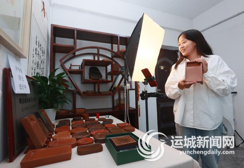 “这款是玲珑系列的,造型比较简洁,以圆形和方形为主……”走进绛州澄泥砚文化艺术园,主播杨智琪正在为直播间的观众讲解手中的砚台。
