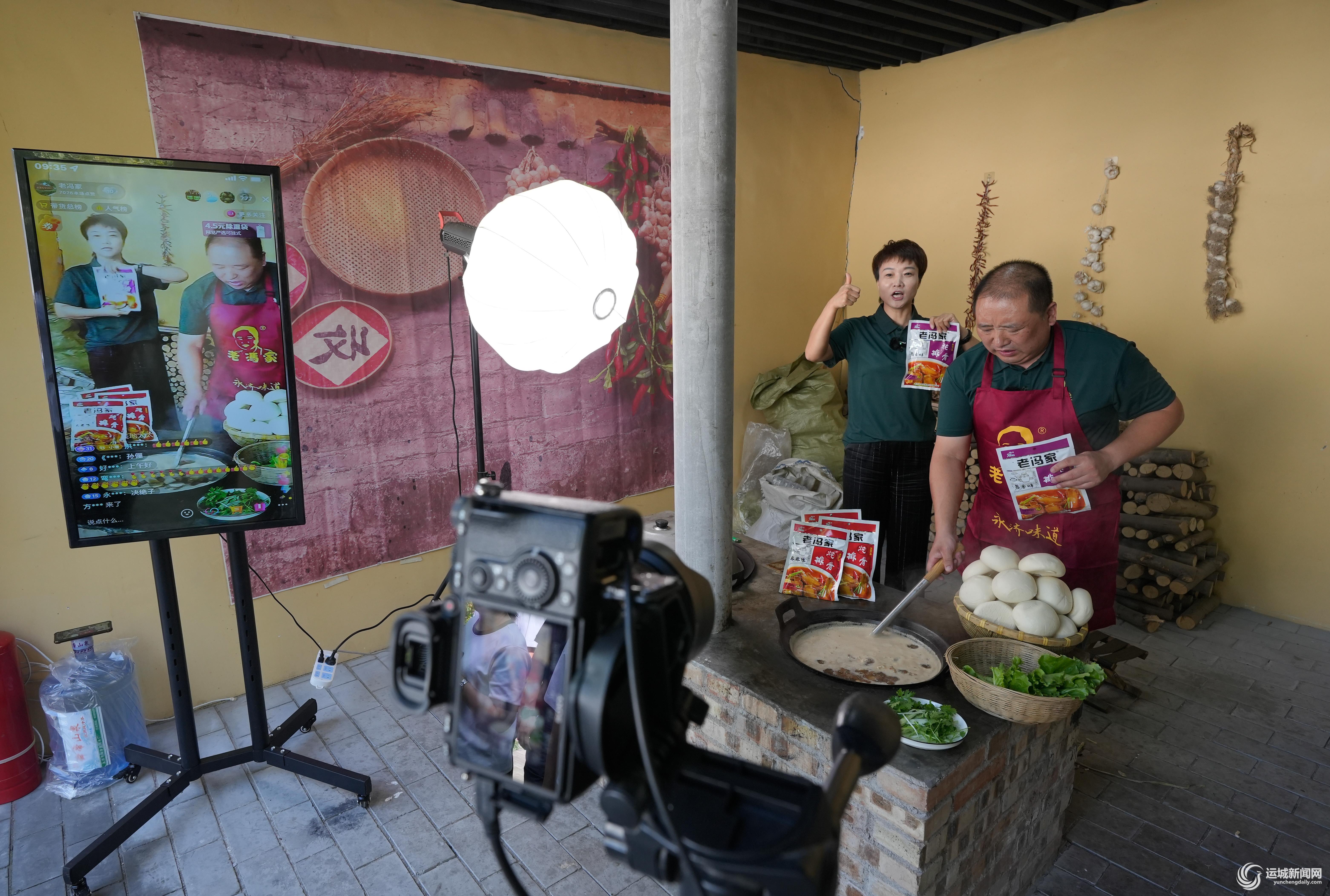 在永济市乡村e镇直播厨房,电商工作人员边做酱料边直播销售。本报记者 闫 鑫 摄
