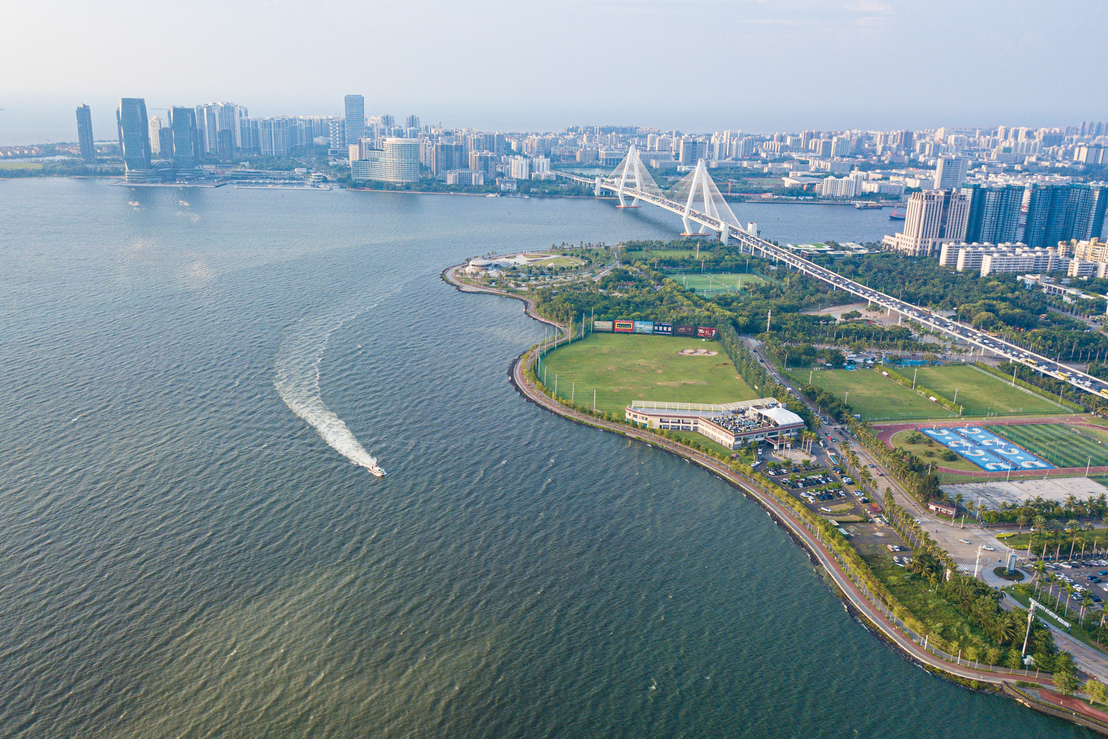 近日在海南省海口市拍摄的海口湾景色(无人机照片)。海口湾位于海南省海口市中心区,海湾面积268.2平方千米,打造了“椰风海韵、湾城融通”的海湾景观,是海口市发展的重要依托和生态名片。