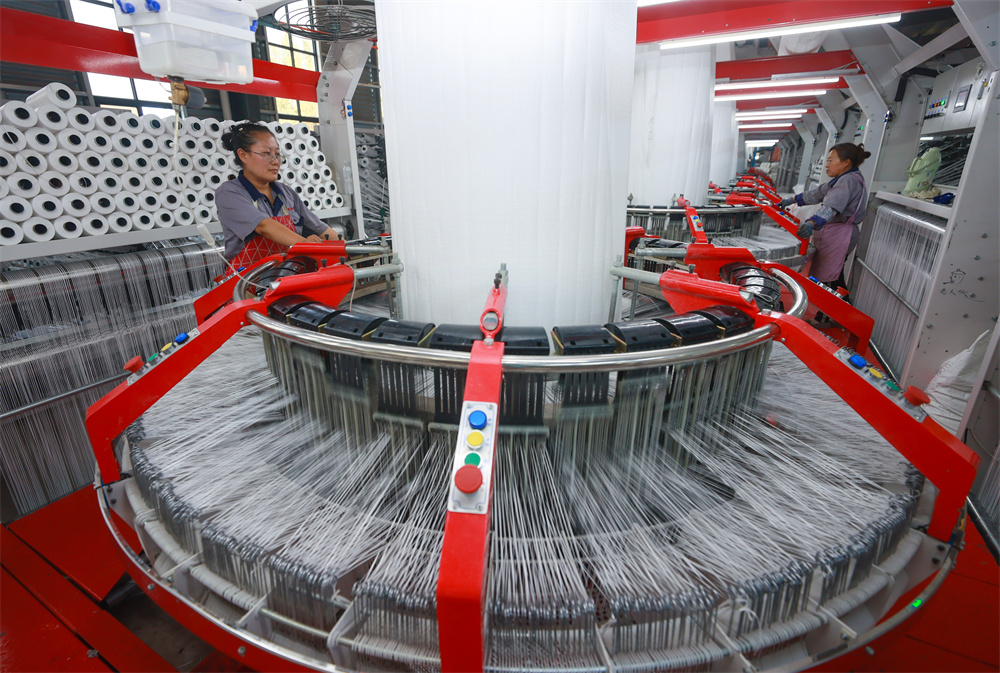 9月4日,位于平陆县的山西环宇纺织制品有限公司内,工人在环保布袋生产线上忙碌。