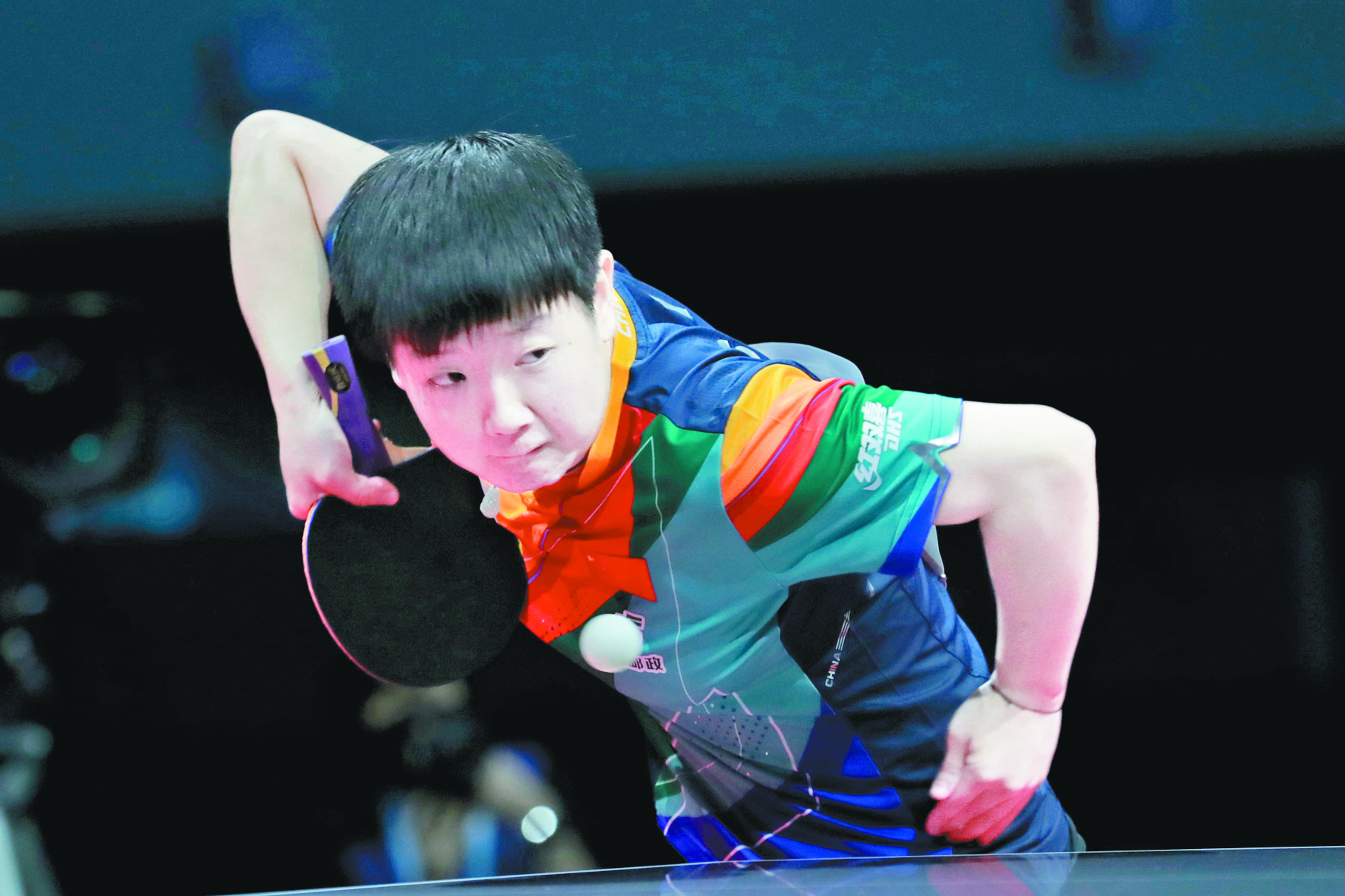 9月5日,中国队选手孙颖莎在比赛中发球。她以3比0战胜韩国队选手申裕斌。