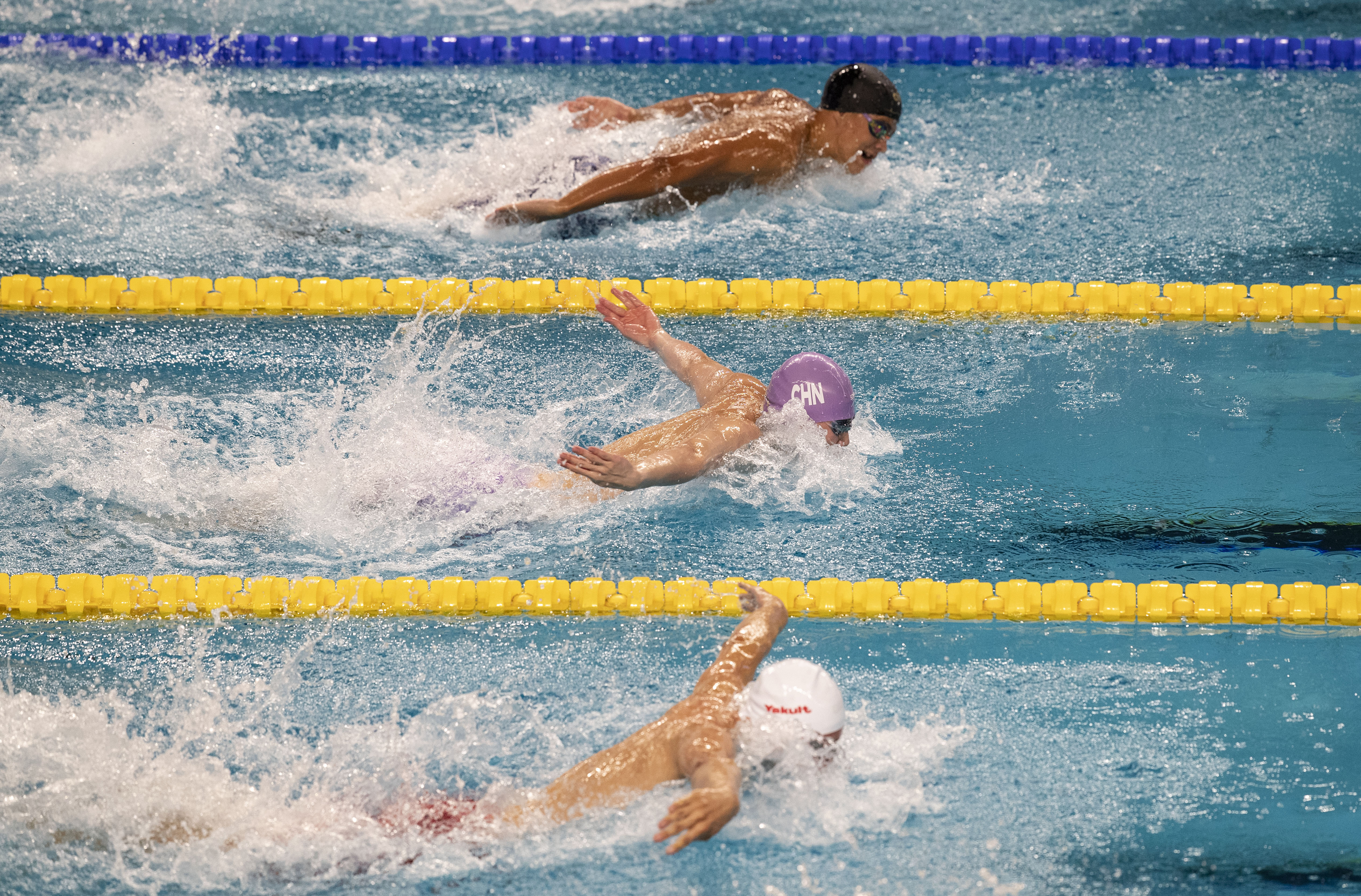9月6日,中国选手王曦喆(中)在男子100米蝶泳决赛中。他以52秒65的成绩获得亚军。