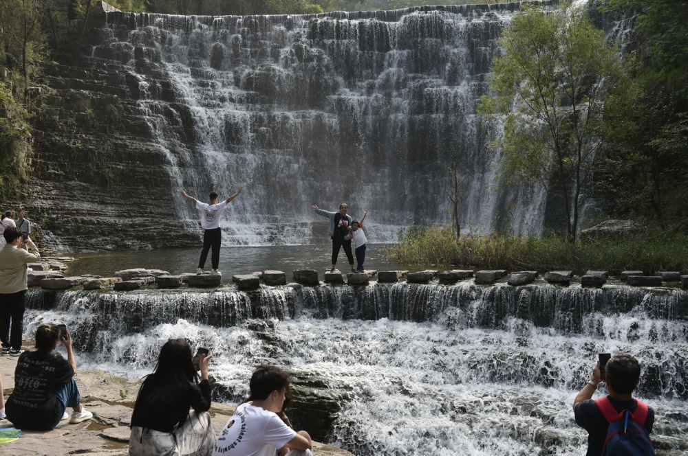 9月6日,游人在位于林州市的太行大峡谷瀑布前游览拍照,感受秋韵。