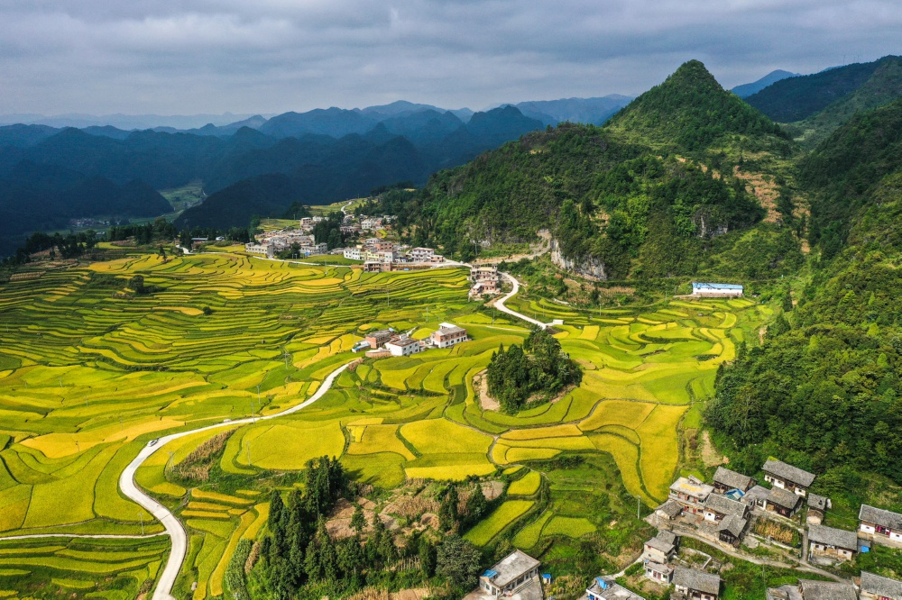 白露将至,贵州省黔南布依族苗族自治州贵定县沿山镇腊利梯田里的水稻逐渐成熟,呈现出一幅丰收在望的秋日画卷。