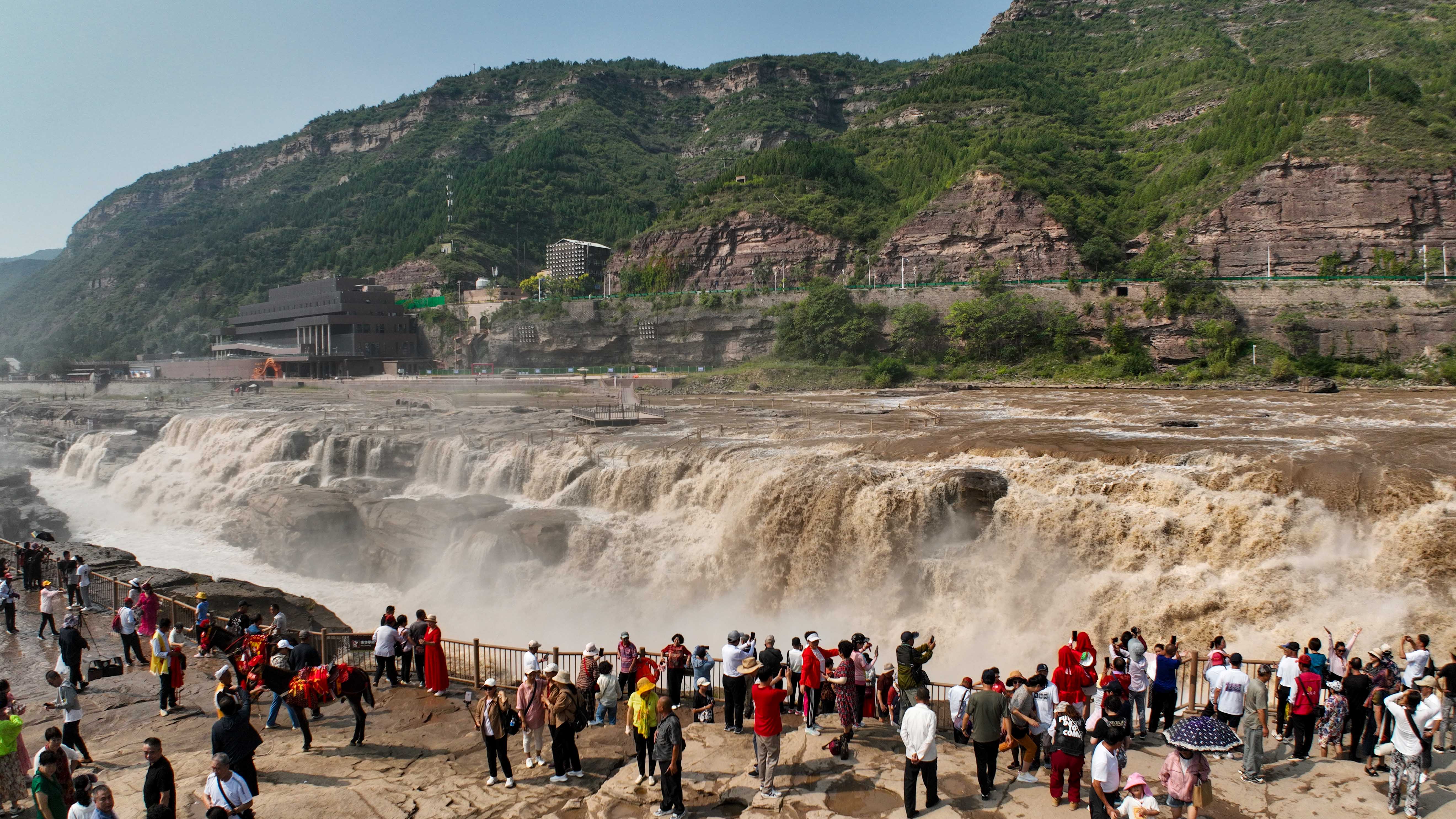▲9月8日,游客在黄河壶口瀑布景区游览(无人机照片)。