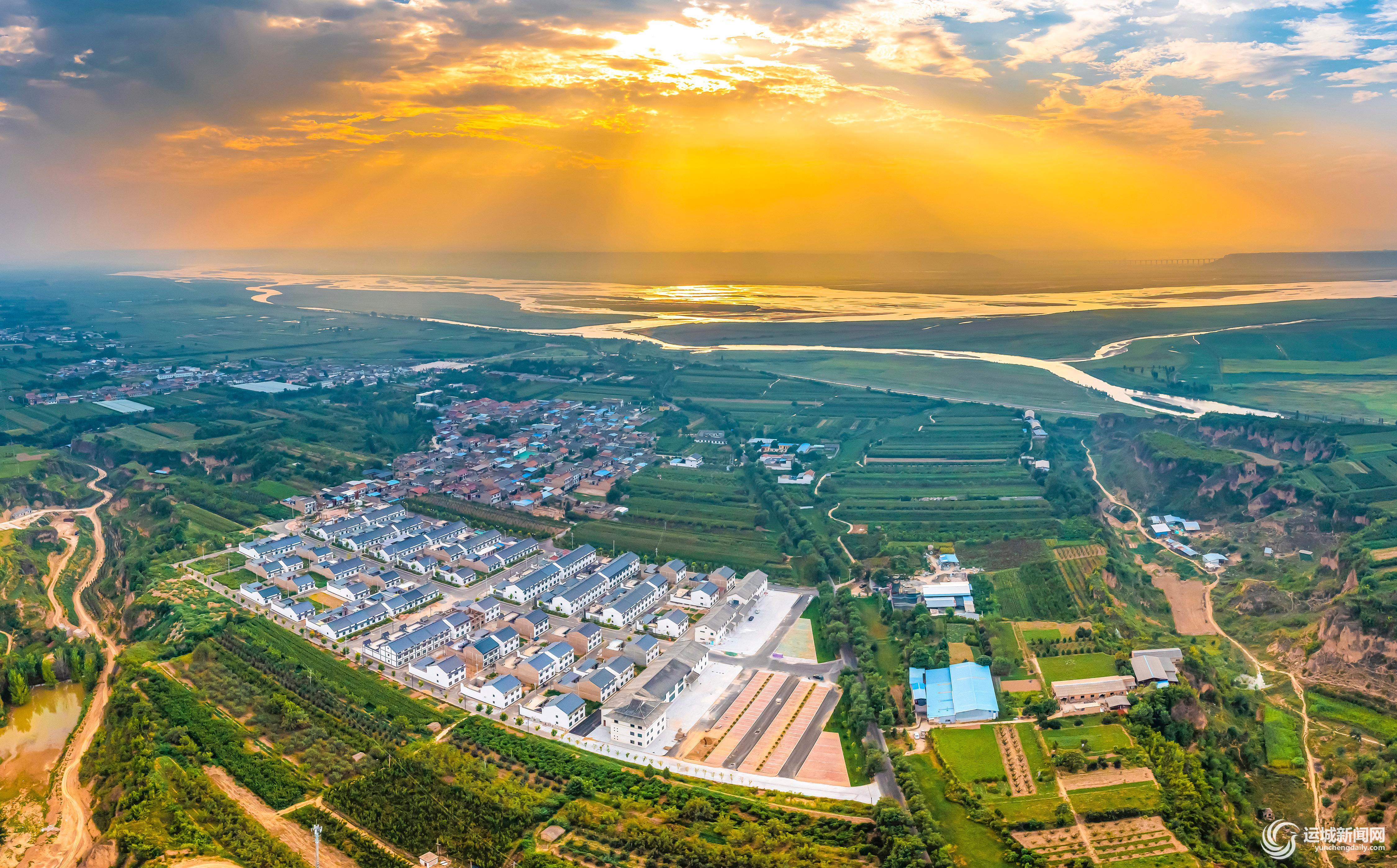 9月9日,万荣县境内黄河沿岸生机盎然,阳光普照下的黄汾交汇处美景与新农村民居(庙前村移民新区)遥相呼应,呈现一片生态宜人景象。