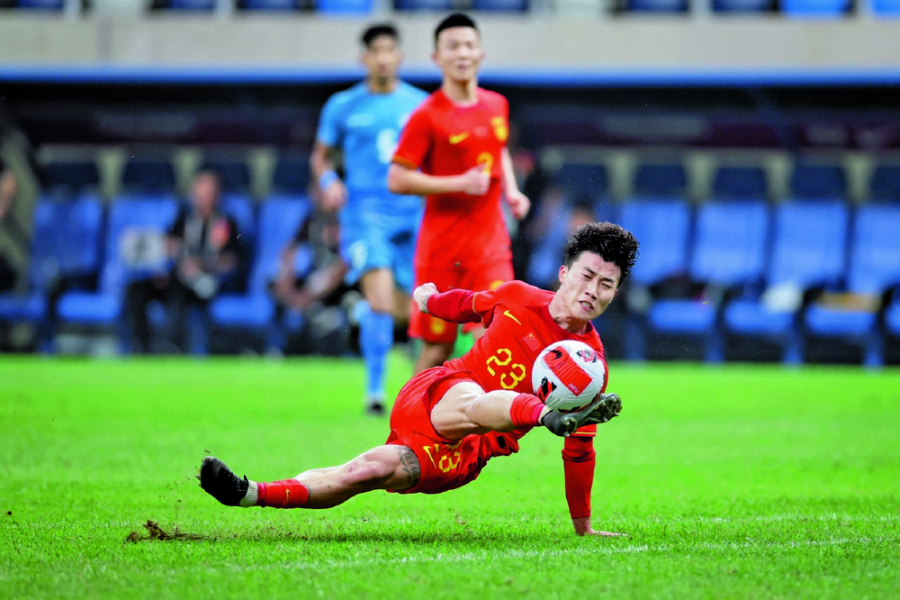 9月9日,中国队球员谢文能在比赛中射门。当日,在辽宁大连举行的2024年卡塔尔U23亚洲杯预选赛暨巴黎奥运会男足亚洲区资格赛G组第二轮比赛中,中国队以2比1战胜印度队。 新华社记者 潘昱龙 摄