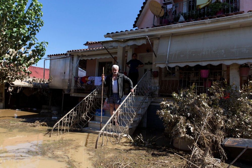 9月12日,希腊中部卡尔季察地区的一处村庄,人们站在遭遇洪水的房屋前。希腊国家电视台10日报道,该国中部地区暴雨和洪水已导致15人死亡。