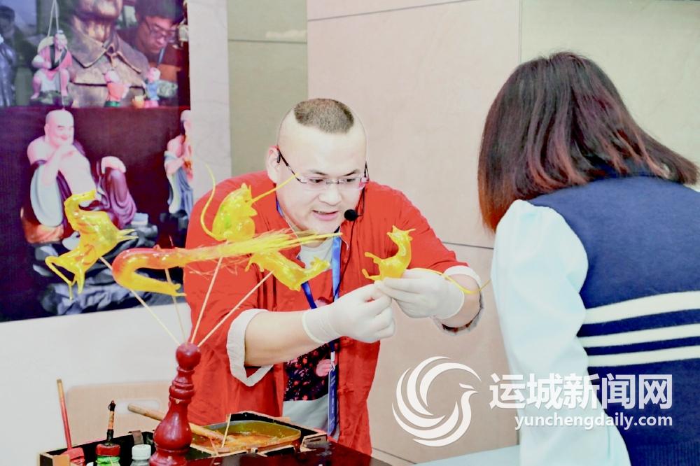 “说运城道运城,运城的宝物数不清。‘国保’102处,全国市级第一名。关帝庙、永乐宫,西侯度的火正红……你到运城看一看,华夏文明收眼中……”在参观人多的时候,非遗传承人师林林,会暂停吹糖人的活动,在现场表演一段快板,活跃现场气氛的同时,也能更生动地推介运城丰富的文旅资源。