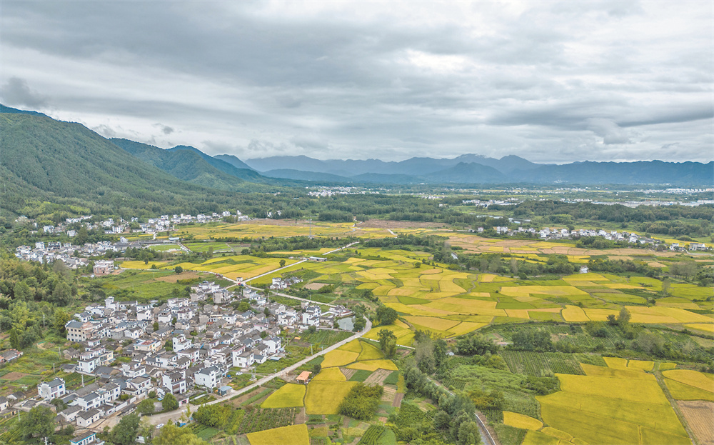 这是9月13日拍摄的黟县碧阳镇附近的水稻田和徽派民居(无人机照片)。
