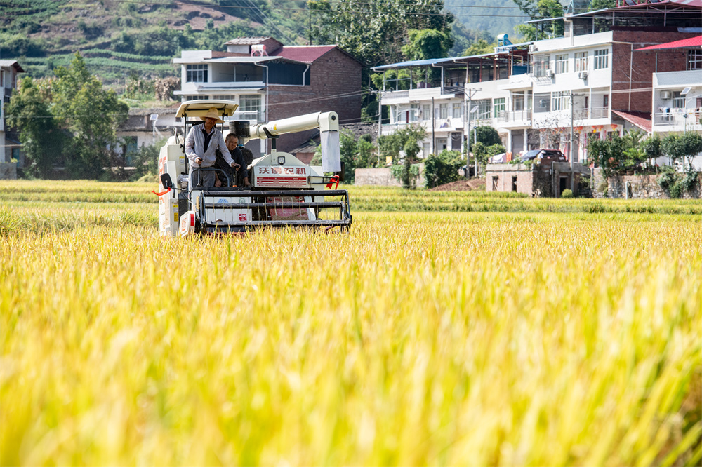 9月14日,稻农驾驶着农机在稻田里收割水稻。 金秋时节,重庆市巫山县庙宇镇稻谷陆续进入成熟收割期,稻农们抢抓晴好天气,收割水稻。 新华社记者 唐 奕 摄
