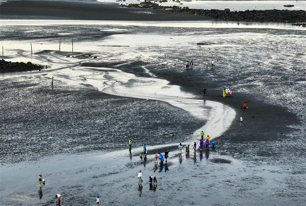 9月16日,游客在江苏省启东市“十里海湾”滩涂上游玩。
