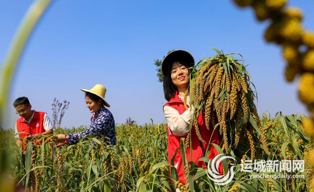 9月14日,夏县南大里乡南郭村窑坡山谷子种植基地,志愿者正帮助农民抢收谷子。