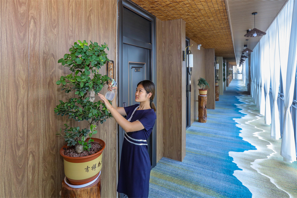 在“脽上人家”民宿里,工作人员在打理绿植。