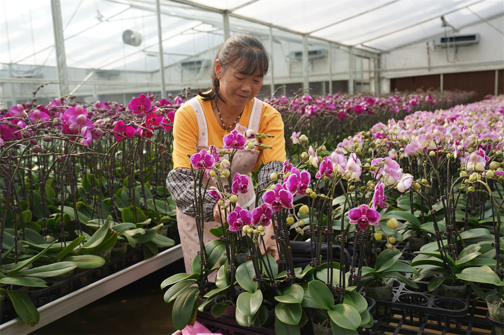 9月18日,农户在云南省开远市一座大棚内挑选蝴蝶兰。