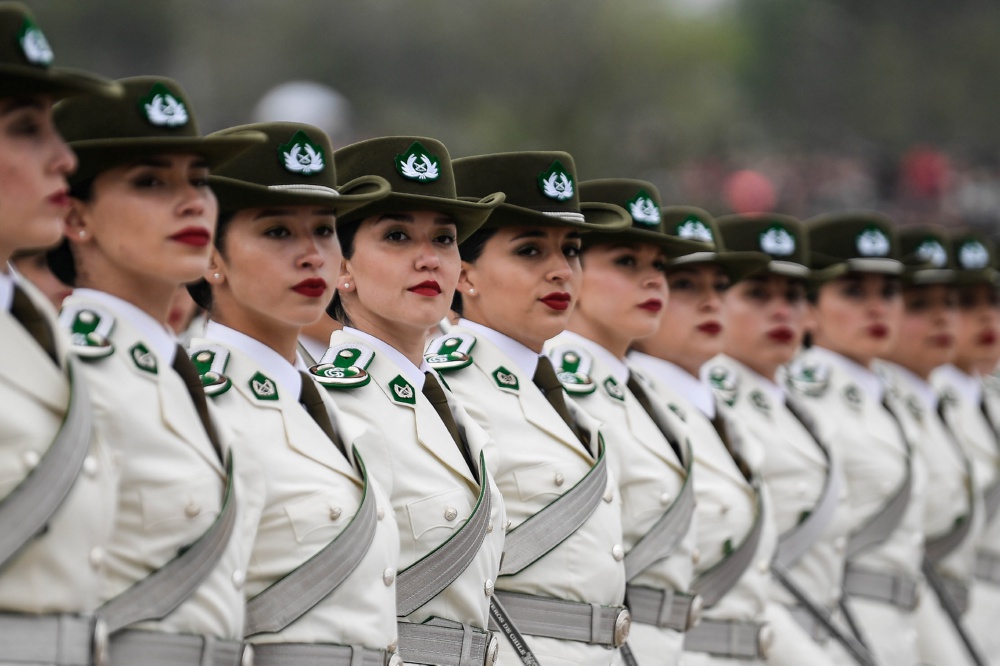 9月19日,在智利首都圣地亚哥,女宪兵在阅兵式上列队行进。当日,智利陆军节阅兵式在首都圣地亚哥奥伊金斯公园举行。智利陆海空三军和警察部队7700多人参加阅兵式。