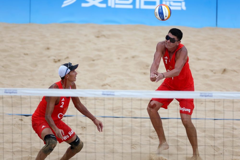 当日,在浙江宁波进行的杭州亚运会沙滩排球男子小组赛A组比赛中,中国组合阿卜杜哈力克江·穆太力普/吴佳欣以2比1战胜菲律宾组合詹姆斯·布伊特拉戈/祖德·加西亚。