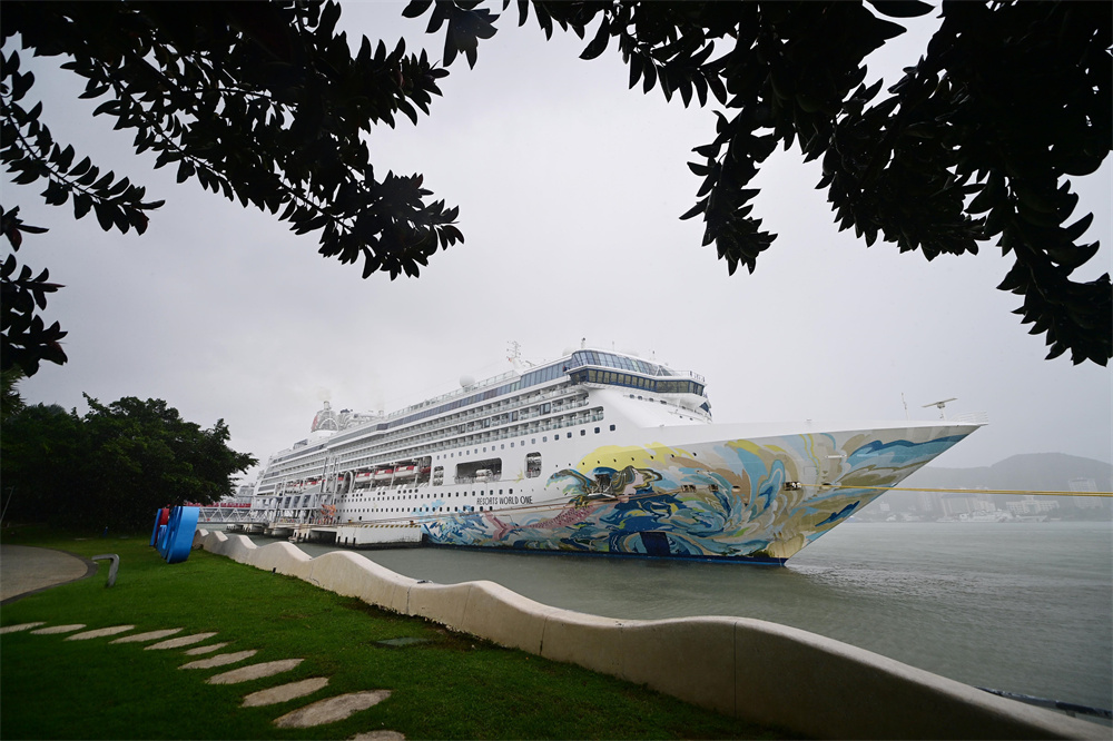 上图:当日,“名胜世界壹号”邮轮停泊在三亚国际邮轮港码头。