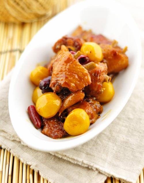 6.炒鸡翅的时候翻动不要太勤,10秒~15秒的样子翻动一下,过程大约两分钟,煎至鸡翅的表面金黄,放点料酒、生抽、老抽、白糖炖煮10分钟左右,这时加入板栗炖煮一会儿,直至板栗软糯即可。