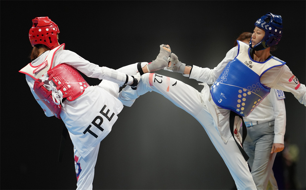9月26日,骆宗诗(右)与罗嘉翎在比赛中。当日,在杭州亚运会跆拳道女子57公斤级决赛中,中国选手骆宗诗战胜中国台北选手罗嘉翎夺冠。