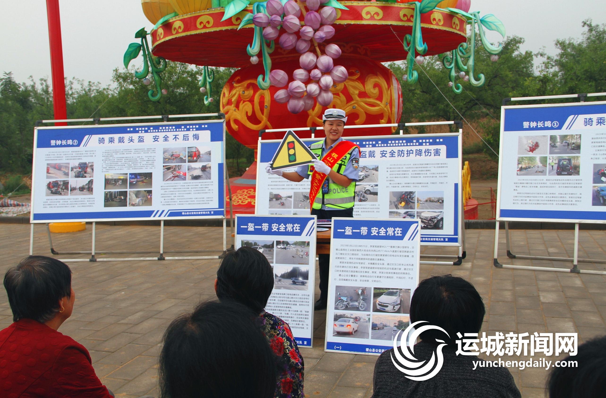 活动开始前,群众在民警的组织配合下,与印有“‘有安全 更团圆’山西交警与你同在”的画框合影并发布微信朋友圈,以此来带动身边的朋友遵守交通法规,安全文明出行。表演开始后,气势磅礴的锣鼓说唱、脍炙人口的快板等节目,使观众在嬉笑之间,潜移默化地增长了交通安全常识。其间,民警还组织多名村民上台,采取击鼓传图的方式,向他们宣讲交通安全常识,并为他们发放交通安全水杯。在交通事故案例展板前,民警结合辖区近期事故案例,以身边事,惊醒身边人。