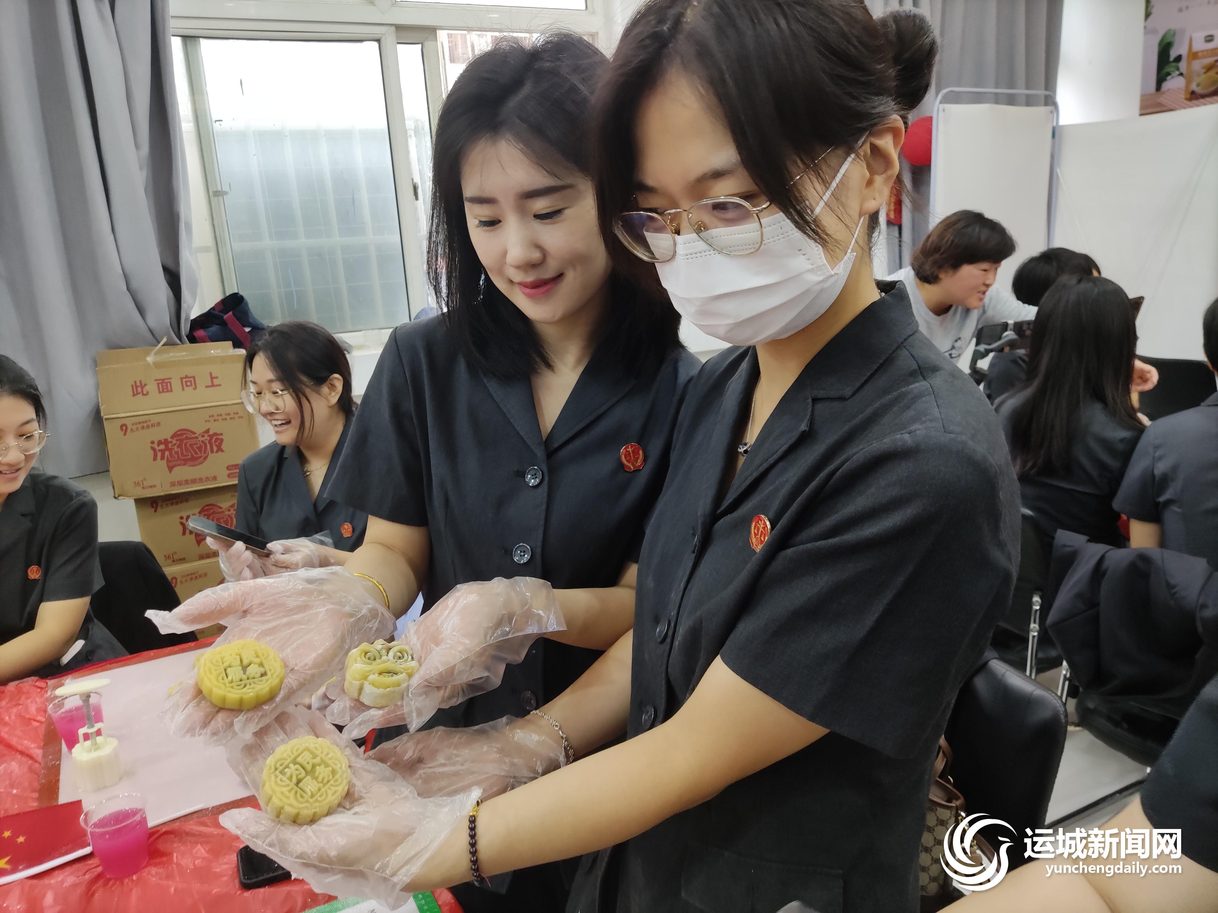 活动中,社区居民与干警齐聚一堂,在专业人士的指导下,认真学习月饼制作方法。大家一边商量着做法,一边揉面团、包馅料,并挑选心仪的雕花模具,给月饼印上“为民服务”“法以砥焉”“帮创共建”“如我在诉”等字样。在喜悦祥和的气氛中,一个个精致的“法式”月饼便做好了(下图)。