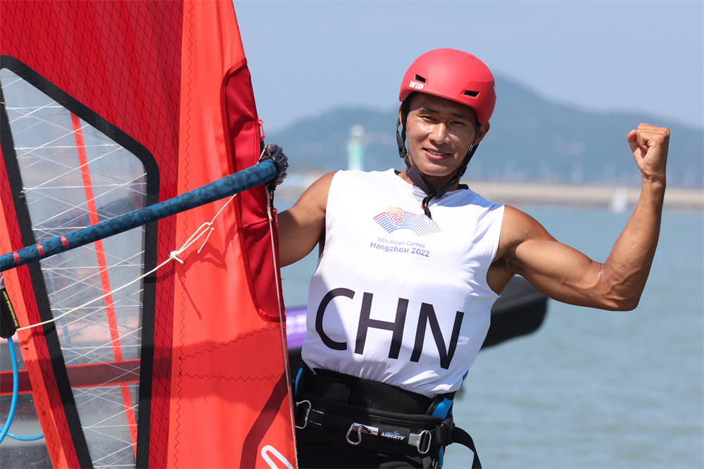 当日,在杭州亚运会帆船项目男子水翼帆板-iQFoil级比赛中,中国选手毕焜夺得冠军。