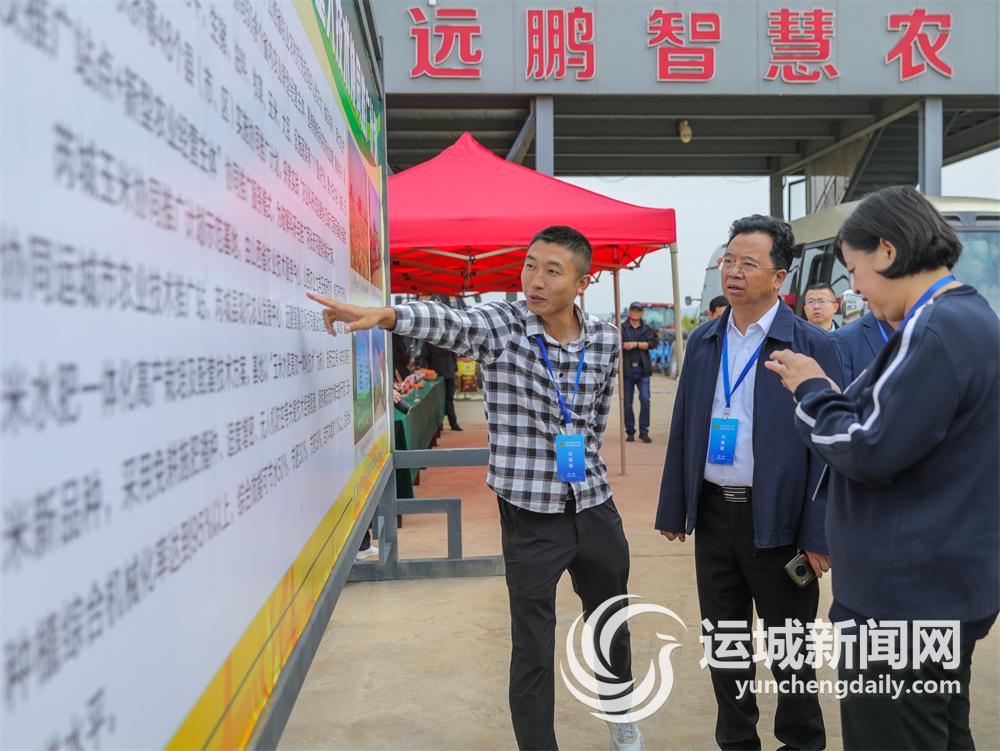 “入口道路两边的玉米田块预计亩产850公斤,加上前茬小麦亩产652公斤,能够实现亩产‘吨半粮’。我们身边的这块,由于地势较低,受渍害影响,生长缓慢,前段时间我们指导农场加强‘一喷多促’,预计亩产也能达到750公斤,加上前茬小麦亩产650公斤,接近‘吨半田’目标。”在芮城县农业农村局高级农艺师李峰朝的介绍下,考察代表连连称赞。