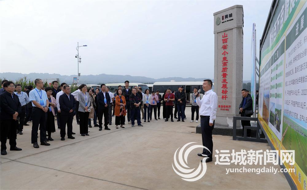 在黄汾百万亩粮食优质高产高效示范芮城基地,芮城县委副书记、县长余敏在向参会代表介绍该县农技服务工作。 记者 金玉敏 摄