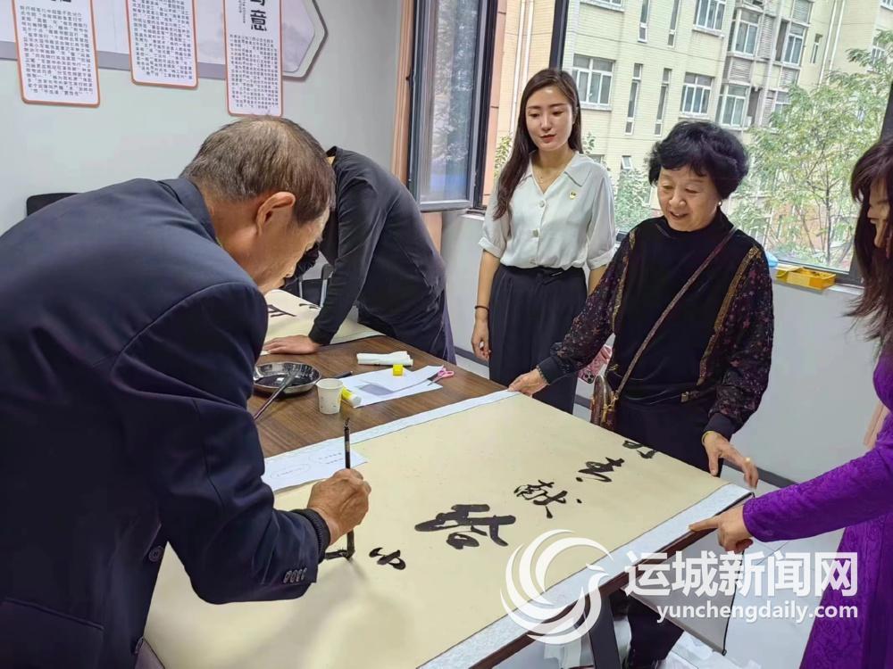 活动中,退休人员与辖区书法爱好者们挥毫泼墨,用一幅幅书法作品,表达对党、对祖国的热爱之情。
