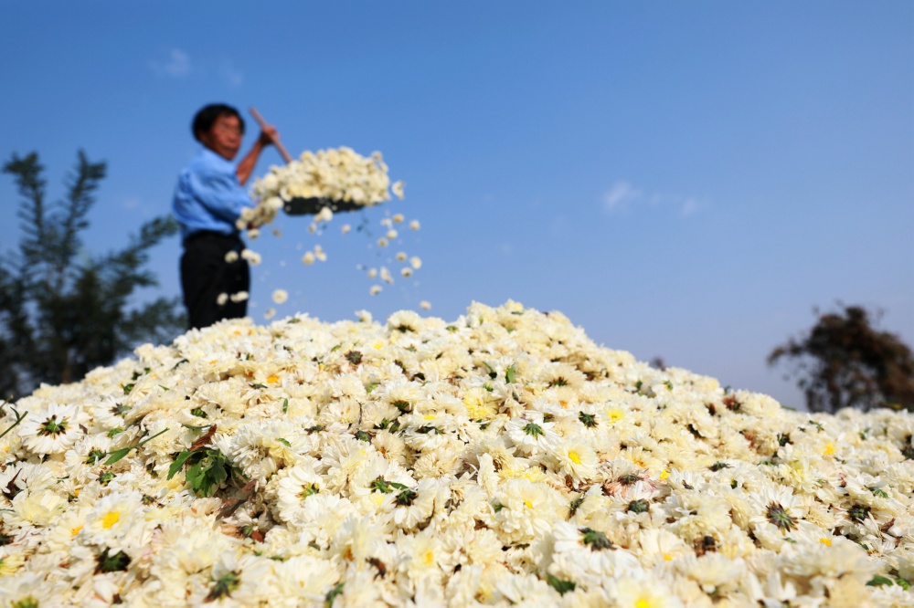 国庆之后,正是收获菊花的深秋时节,在河北省邢台市任泽区大屯乡的菊花种植基地,当地村民忙着采摘、晾晒。