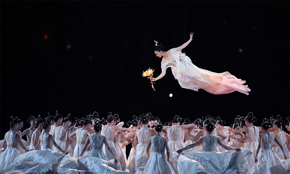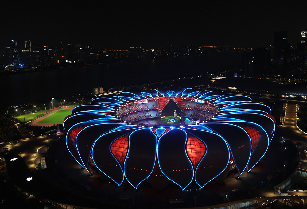 钱塘江畔,夜幕下的杭州奥体中心体育场流光溢彩,宛如一朵美丽的“大莲花”。场内欢声笑语、歌舞飞扬。来自亚洲各国各地区的运动员相聚于此,分享属于他们的体育文化盛宴。