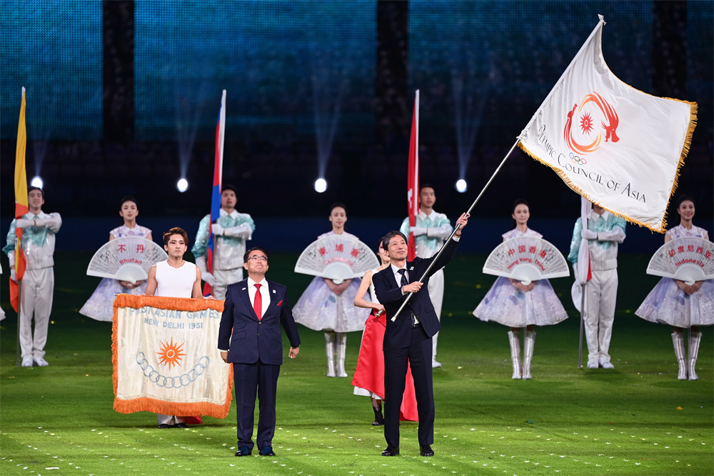伴着亚奥理事会会歌,亚奥理事会会旗缓缓降下。