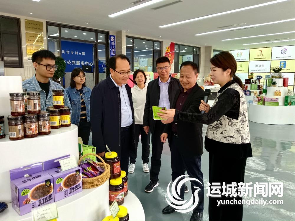 在栲栳镇乡村e镇展示厅,永济市委统战部副部长、工商联党组书记张省会,与镇党委书记李海锋、镇长周宏民等,共同调研农特产品销售情况。