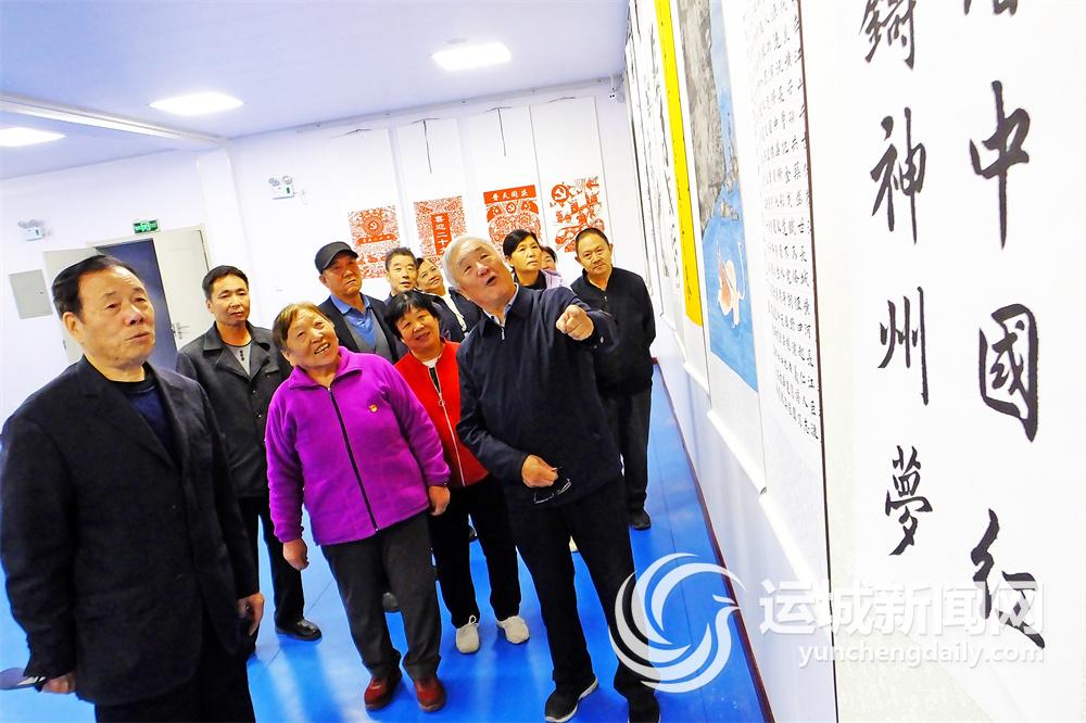 10月10日,新绛县老年大学学员在欣赏交流创作的“夕阳红迎重阳感恩党”书法书画作品。