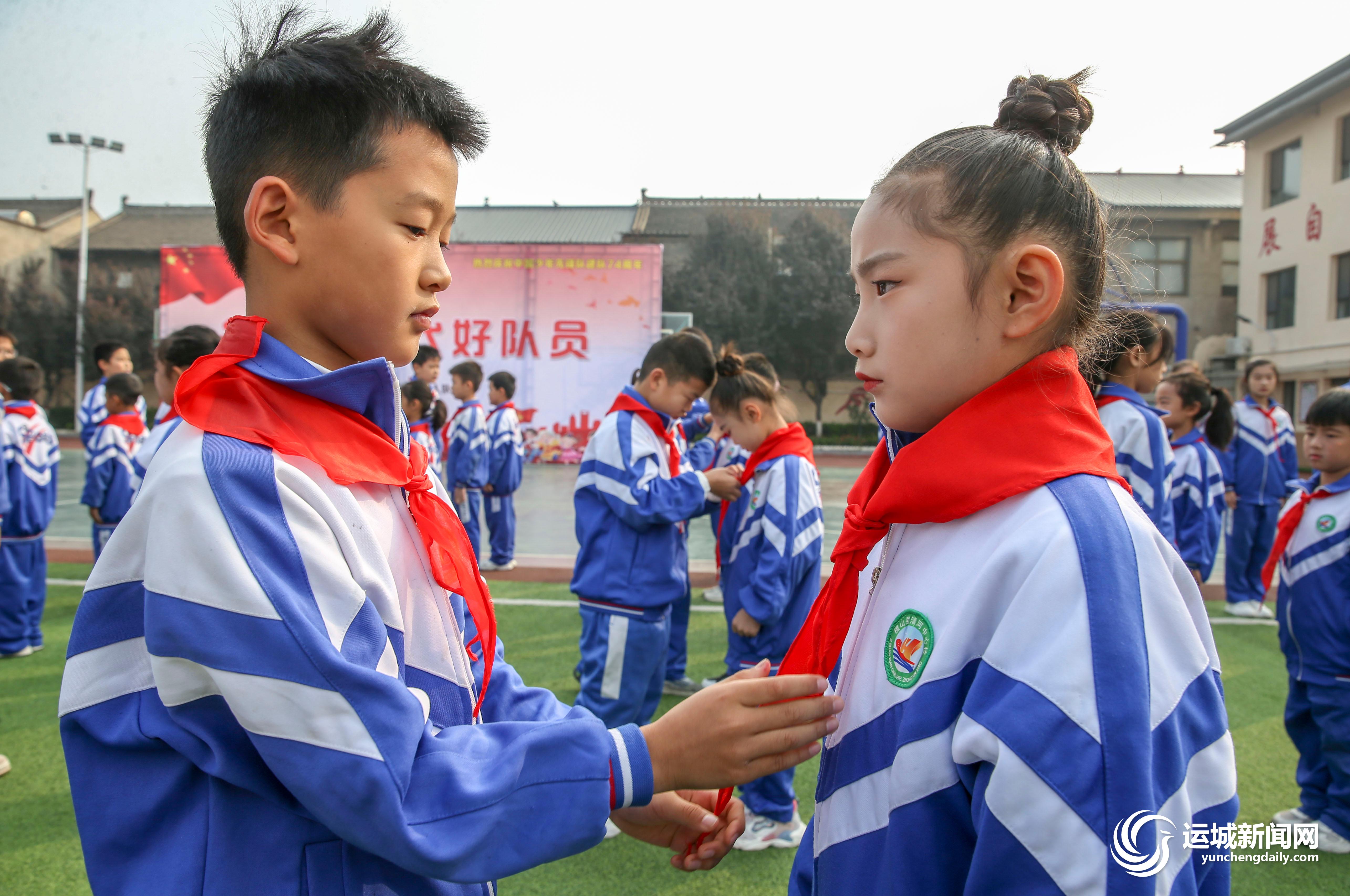 为庆祝中国少年先锋队建队74周年,引导队员继承和弘扬少先队光荣传统,10月13日,稷山县清河小学举行了“争做新时代好队员”新队员入队仪式。 星星火炬,代代相传;红旗一角,鲜艳荣光。当日,该校五年级少先队队员代表为新队员戴上鲜艳的红领巾,并互敬队礼,77名新队员正式加入中国少年先锋队。特约摄影 史云平