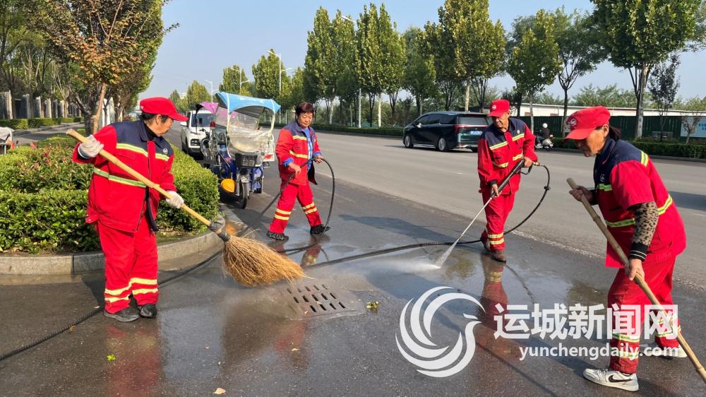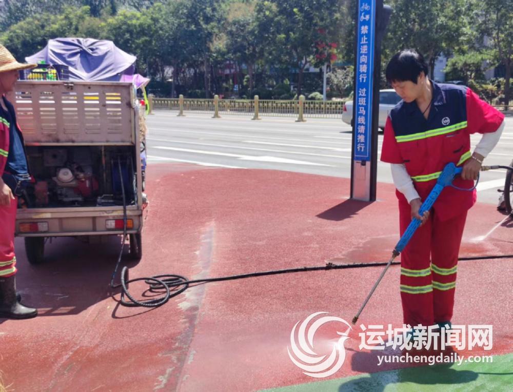 10月10日,市区安邑西路上,几名环卫工人正利用小型冲洗车,对电线杆、路缘石等进行清洁和冲洗。“今早大型洒水车冲洗过后,部分残留的泥水会顺着路缘石流下来形成水坑,有些污水也会溅到辅路上形成污水流,这些地方大型机械车辆无法有效清理,我们便组织环卫工人对人行道、辅道及道路死角的积泥积灰进行快速冲洗和保洁,确保道路洁净。”市城市管理局市容环卫中心东片区负责人刘爱芳介绍。