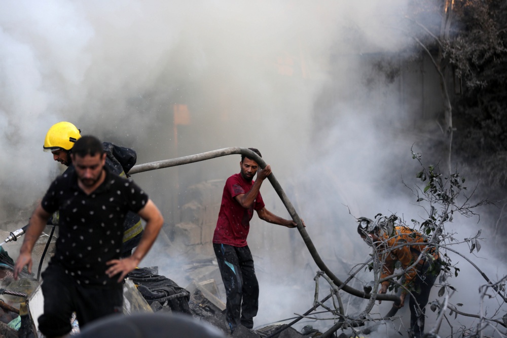 10月14日,在加沙地带南部城市汗尤尼斯,人们在扑灭以色列空袭造成的火灾。