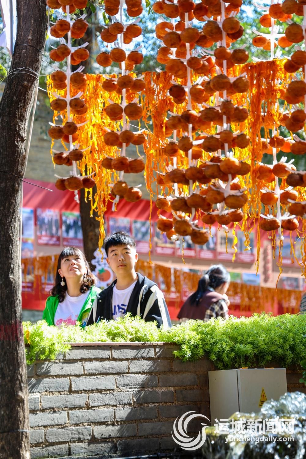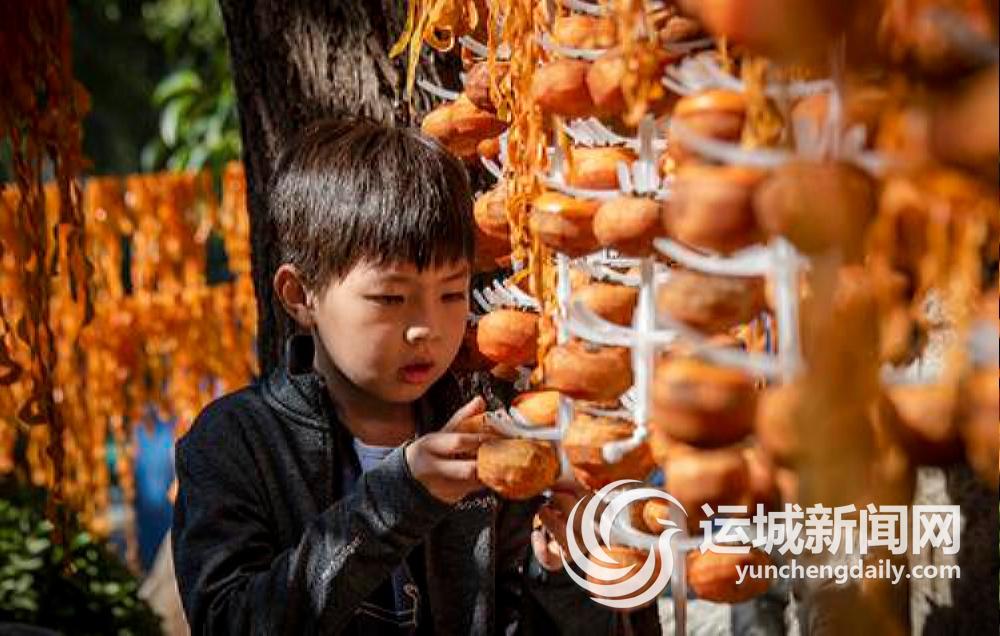 游客们或体验制作柿饼,或穿梭于晾晒的柿子皮之间,陶醉在这金黄色的秋景之中。