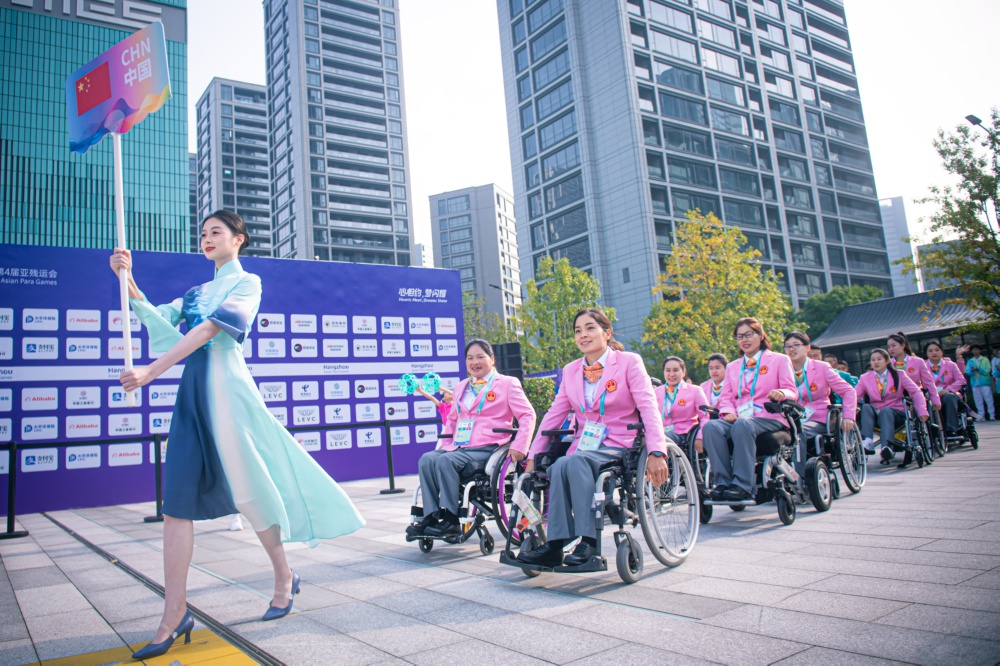 16日上午,杭州亚残运村举行开村仪式暨中国体育代表团欢迎仪式,杭州亚残运村正式投入赛时运行。在简短而热烈的暖场活动后,中国代表团的运动员代表在引导员的带领下依次入场,现场响起热烈的掌声和欢呼声。