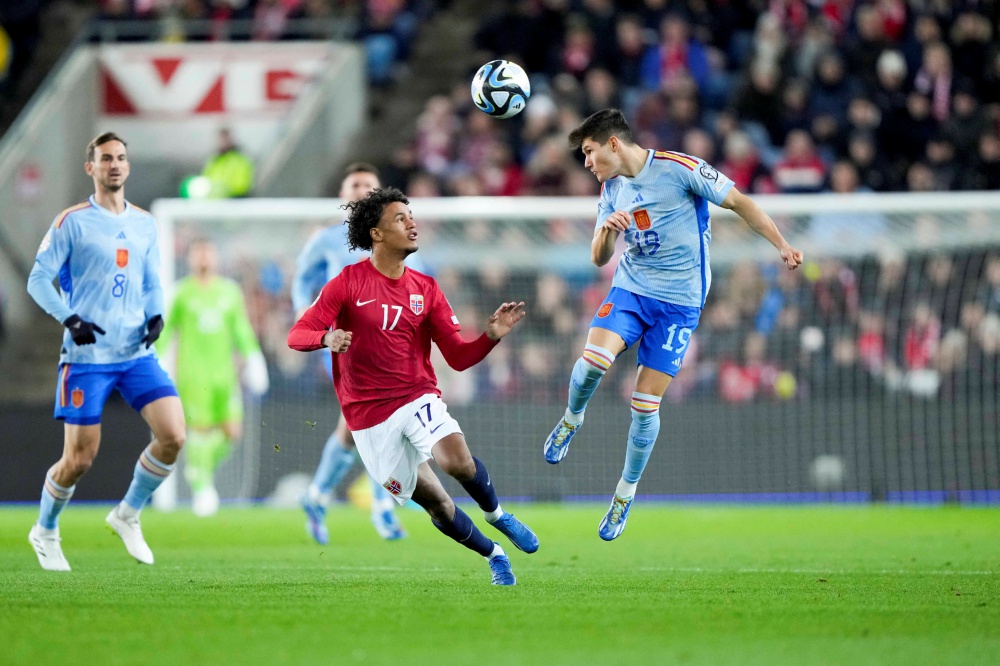 10月15日,西班牙队球员弗兰·加西亚(右)与挪威队球员奥斯卡·鲍勃拼抢。当日,在挪威奥斯陆举行的2024年欧锦赛足球预选赛A组赛中,西班牙队客场1比0战胜挪威队,提前晋级欧锦赛正赛。 新华社/路透