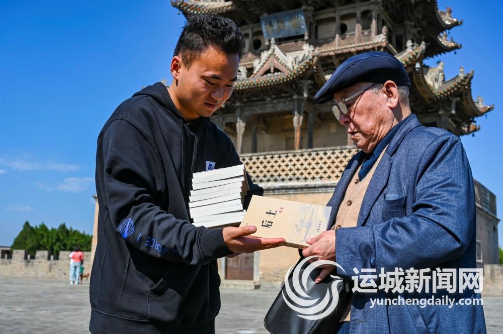 10月16日,万荣县后土文化资深研究者陈振民(右),将其出版的《后土》一书赠给后土祠景区工作人员。