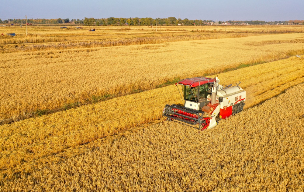 10月14日,农机手在通辽市科尔沁左翼后旗金宝屯镇套布海村驾驶收割机收割水稻。