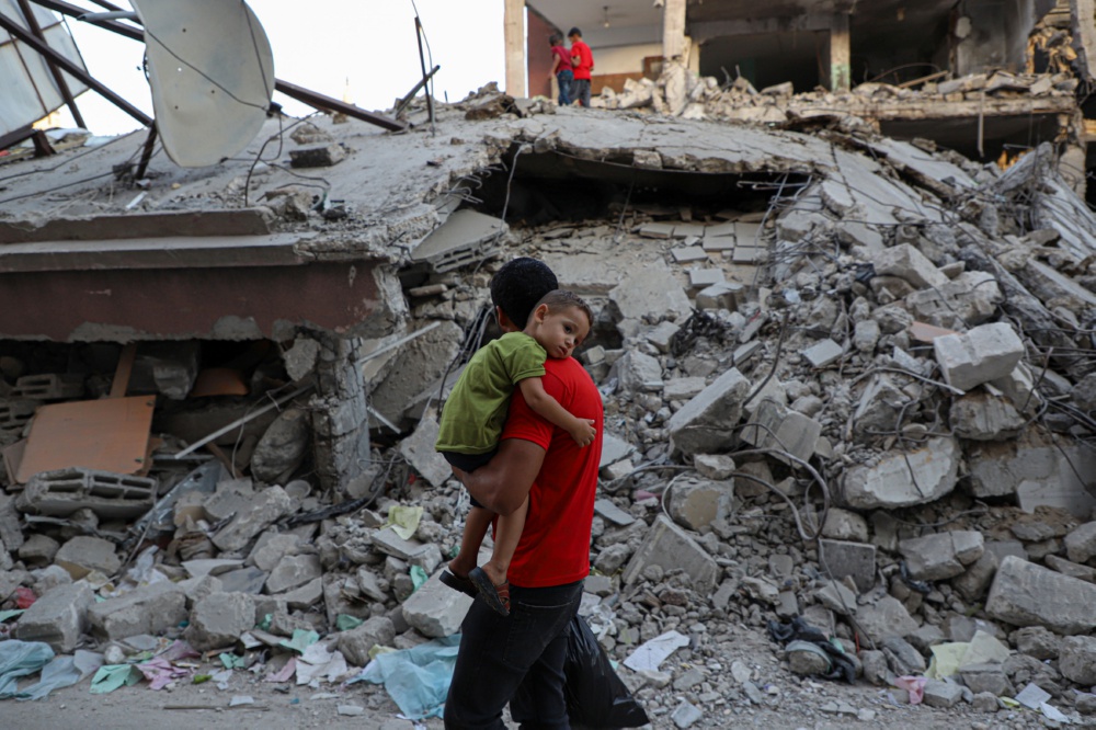 10月16日,在加沙地带南部城市汗尤尼斯,人们从遭以色列空袭损毁的建筑废墟前走过。加沙地带卫生部门16日下午发布的数据显示,以色列袭击加沙地带已造成2778人死亡、9938人受伤。以色列方面数据显示,1400余名以色列人在冲突中死亡。